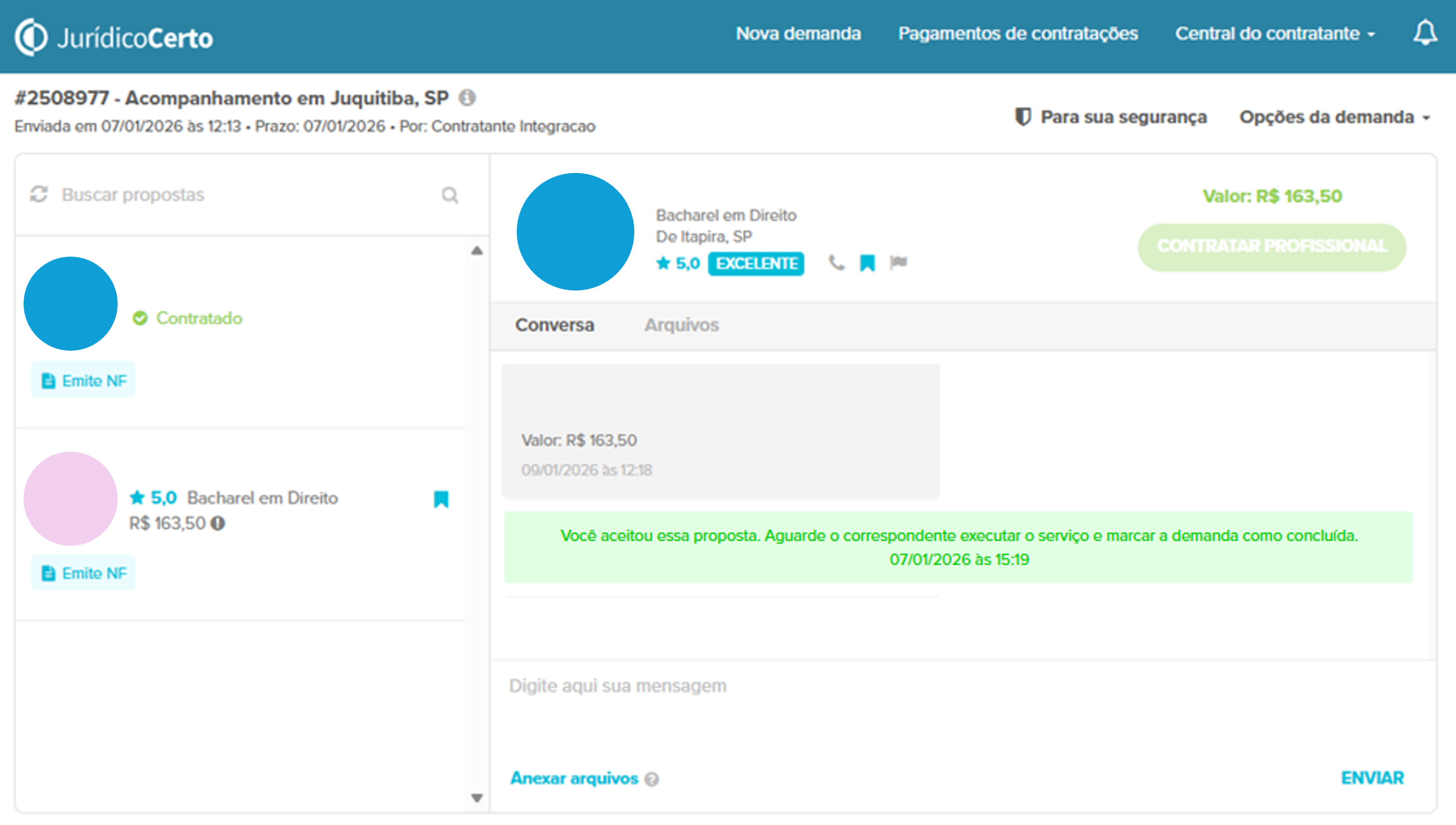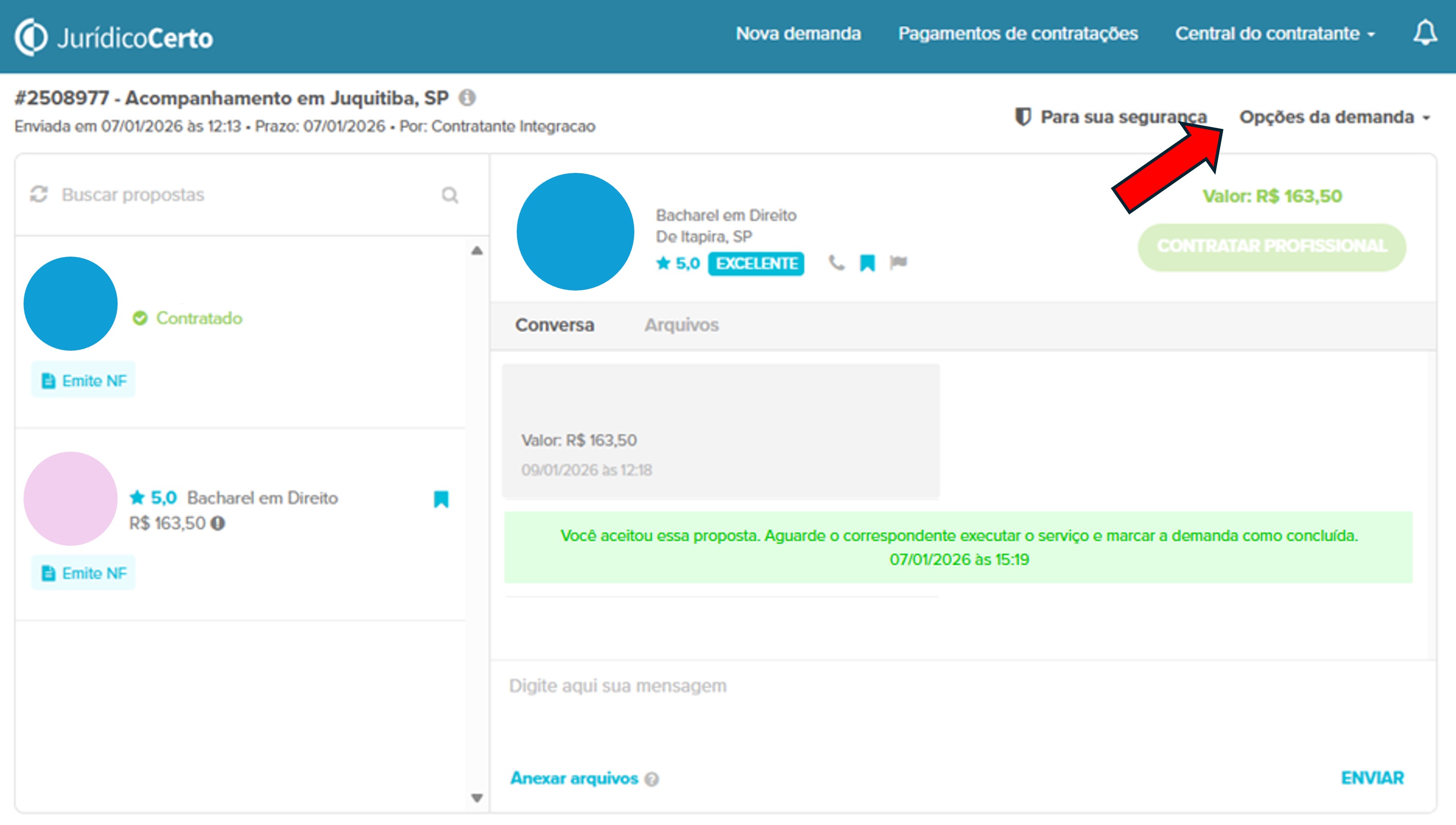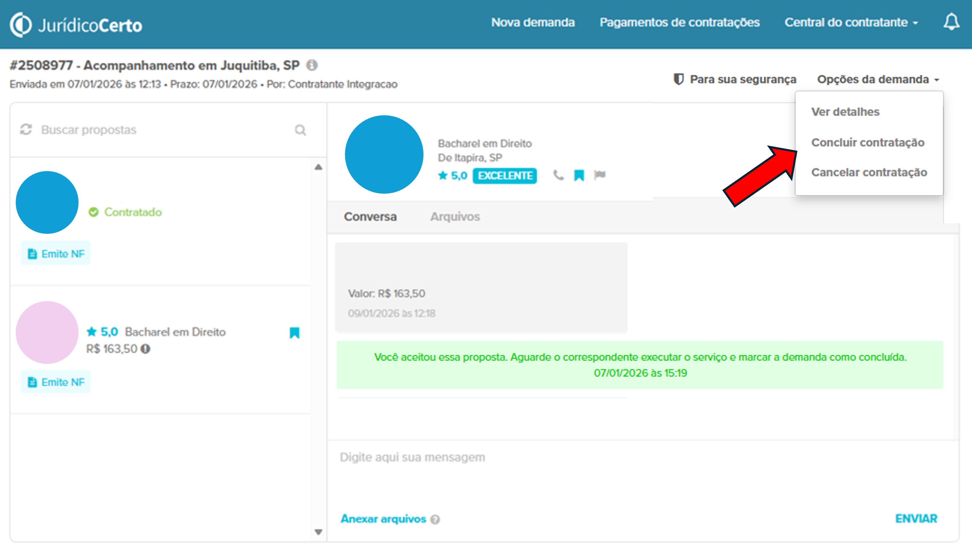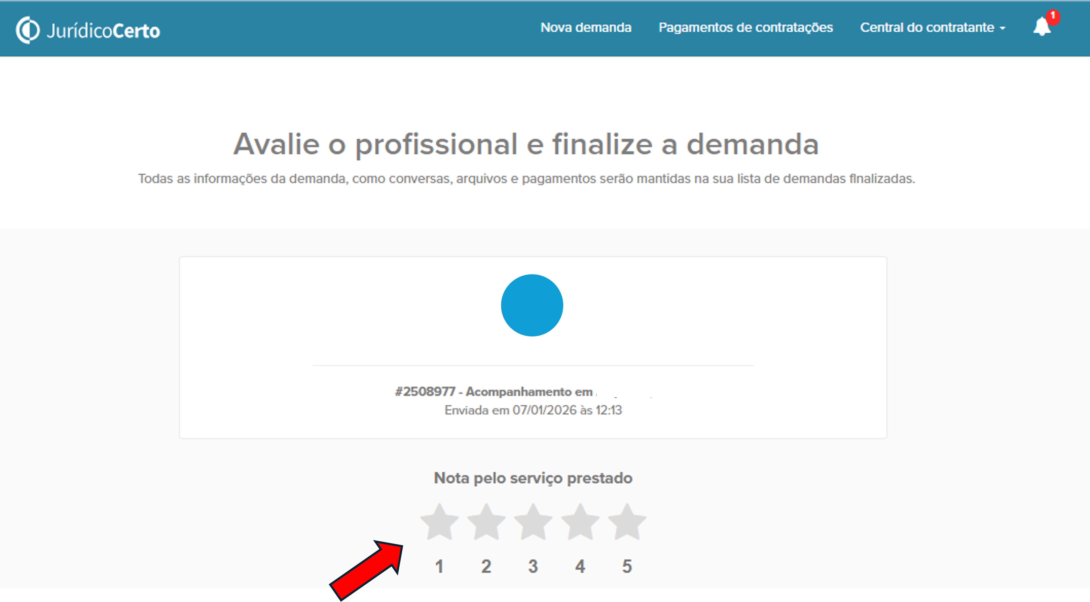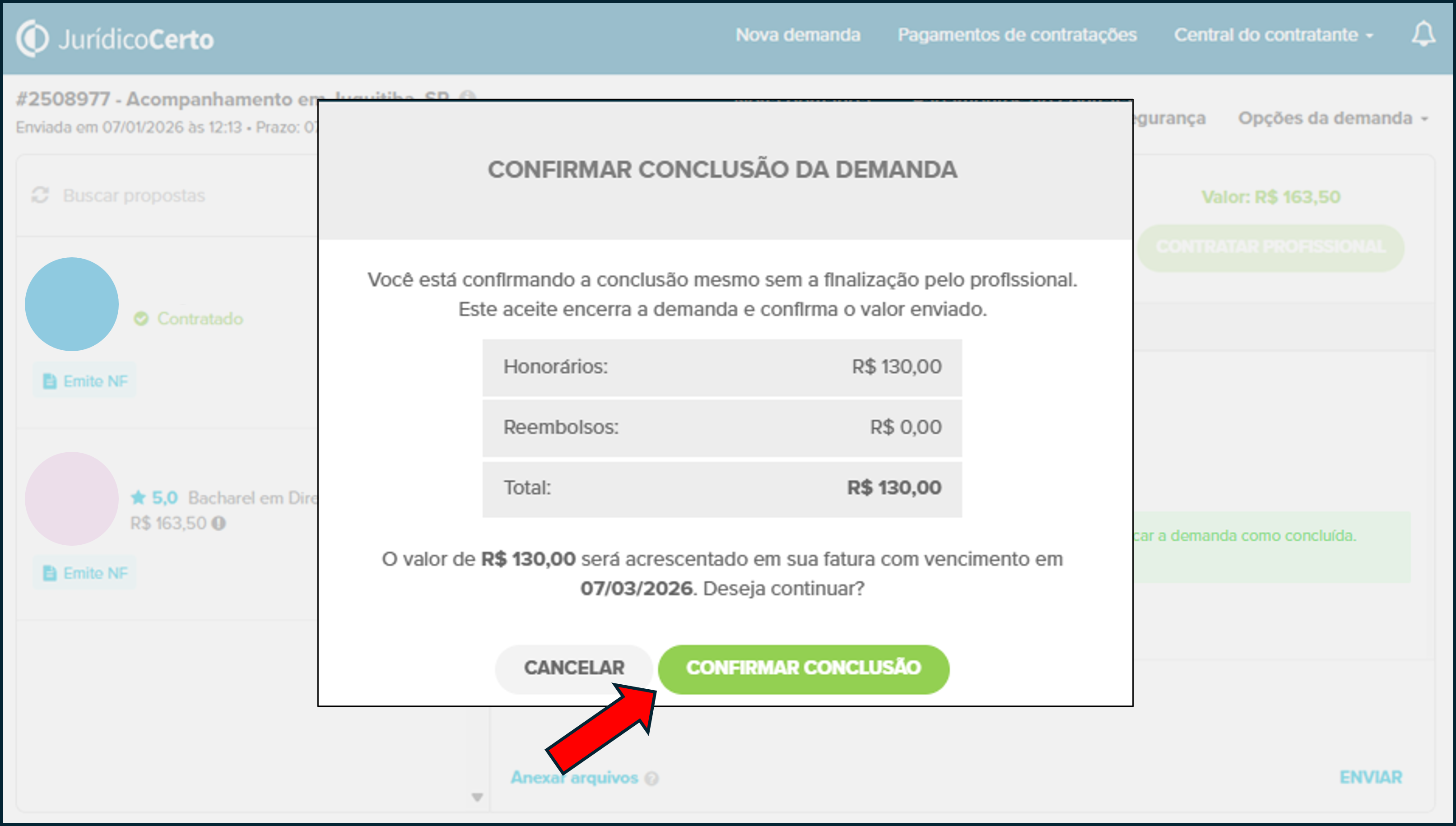 Pensando em tornar sua experiência ainda mais simples e ágil, agora o contratante também pode clicar em “Concluir Demanda” diretamente no Jurídico Certo e seguir para o pagamento, sem precisar aguardar a confirmação do profissional na plataforma.